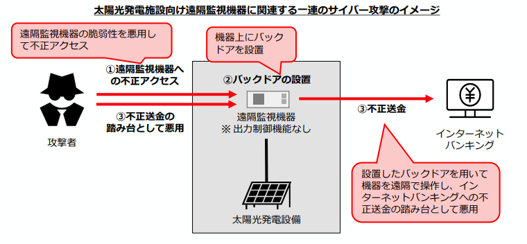 (太陽光発電施設向け遠隔監視機器に関連する一連のサイバー攻撃のイメージ。出典:電力広域的運営推進機関)